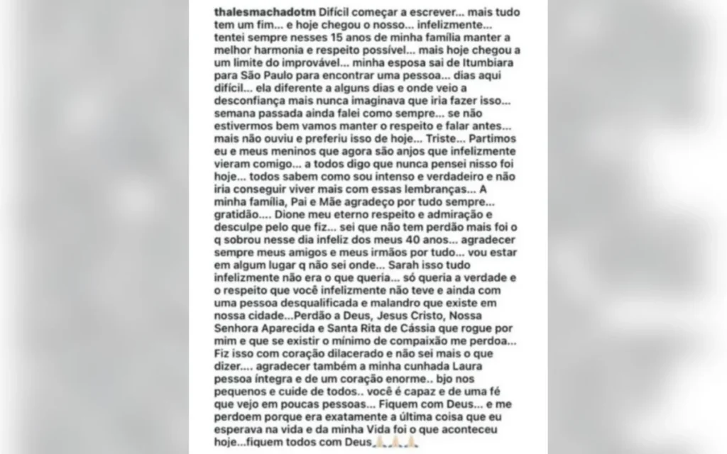 Antes do crime, Thales publicou em uma rede social uma mensagem na qual indicava a intenção de tirar a vida das crianças. Moradores do Condomínio Paraíso, ao tomarem conhecimento do alerta, correram até o imóvel na tentativa de impedir o pior. Chegaram tarde. O que encontraram foi uma cena descrita como chocante, impossível de ser apagada da memória.
