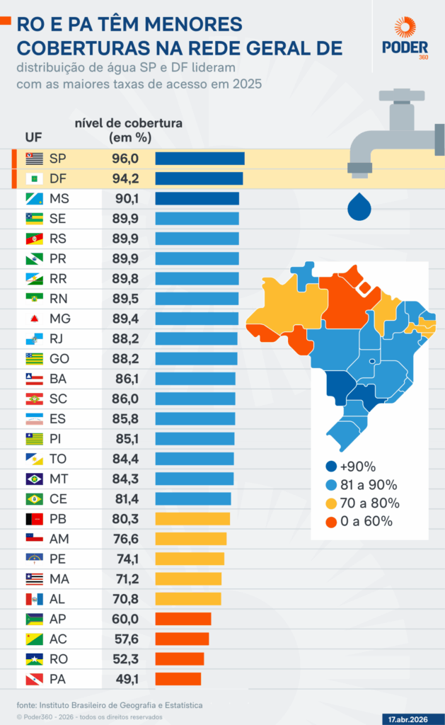 O Brasil tinha 68,3 milhões de domicílios com acesso à rede geral de abastecimento de água em 2025. Os dados são da Pnad Contínua (Pesquisa Nacional por Amostra de Domicílios Contínua) de 2025, divulgada pelo IBGE (Instituto Brasileiro de Geografia e Estatísticas) nesta 6ª feira (17.abr.2026).