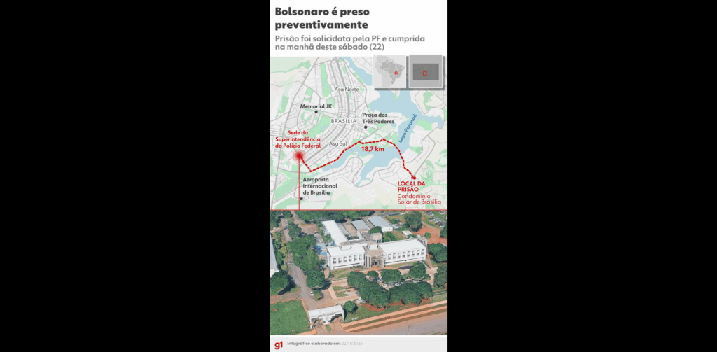 Moraes também destacou que o condomínio onde Bolsonaro cumpria prisão domiciliar fica a cerca de 13 quilômetros do Setor de Embaixadas Sul, em Brasília — distância que, segundo ele, pode ser percorrida em menos de 15 minutos de carro.