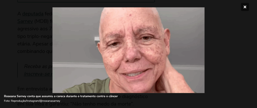 A deputada federal e ex-governadora do Maranhão, Roseana Sarney (MDB-MA), 72 anos, disse não ter medo da morte. A congressista está licenciada da Câmara para o tratamento contra um câncer de mama triplo-negativo, um tipo de tumor raro e agressivo. Ela realiza sessões de quimioterapia e imunoterapia.