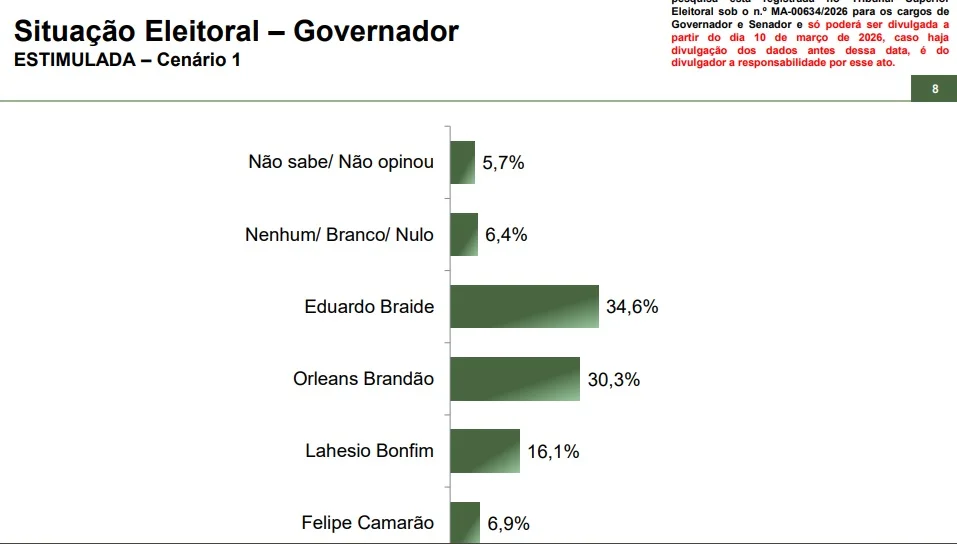 O atual prefeito de São Luís, Eduardo Braide (PSD), lidera a corrida para o governo do Maranhão, em outubro de 2026, seguido de Orleans Brandão (MDB) com, respectivamente, 34,6% e 30,3%, no cenário estimulado. É o que apurou levantamento do Instituto Paraná Pesquisas divulgado nesta terça-feira. A margem de erro da pesquisa é de 2,8 pontos percentuais para mais ou para menos, segundo o instituto.