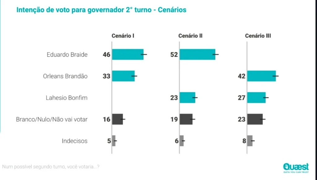O tamanho do problema governista: se ainda havia dúvida sobre a consistência dessa vantagem, o segundo turno elimina qualquer ambiguidade. Braide vence Orleans por 46% a 33%. Contra Lahesio, amplia ainda mais: 52% a 23%.