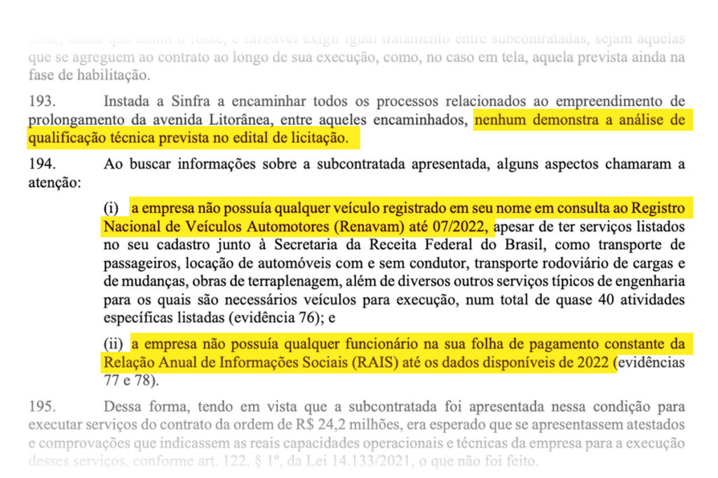“Dessa forma, tendo em vista que a subcontratada foi apresentada nessa condição para executar serviços do contrato da ordem de R$ 24,2 milhões, era esperado que se apresentassem atestados e comprovações que indicassem as reais capacidades operacionais e técnicas da empresa para a execução desses serviços, conforme art. 122, § 1º, da Lei 14.133/2021, o que não foi feito”, disparou o Tribunal de Contas da União.